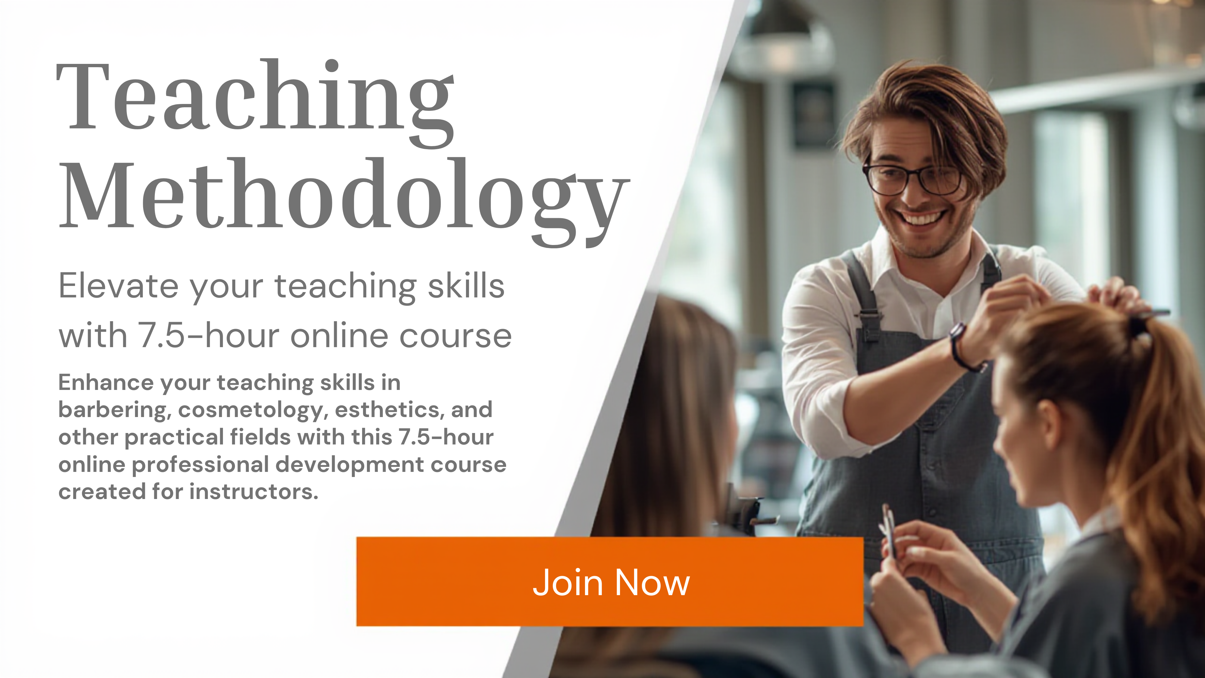 Elevate your teaching skills with the Teaching Methodology for Technical and Creative Professions course. Designed to equip educators in barbering, cosmetology, esthetics, and other hands-on disciplines, this 7.5-hour online professional development course provides practical tools and strategies to teach with confidence, clarity, and impact. Join us and take your teaching to the next level!